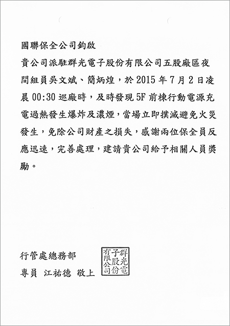 南港展覽館感謝警衛隊隊長康文龍克盡職責